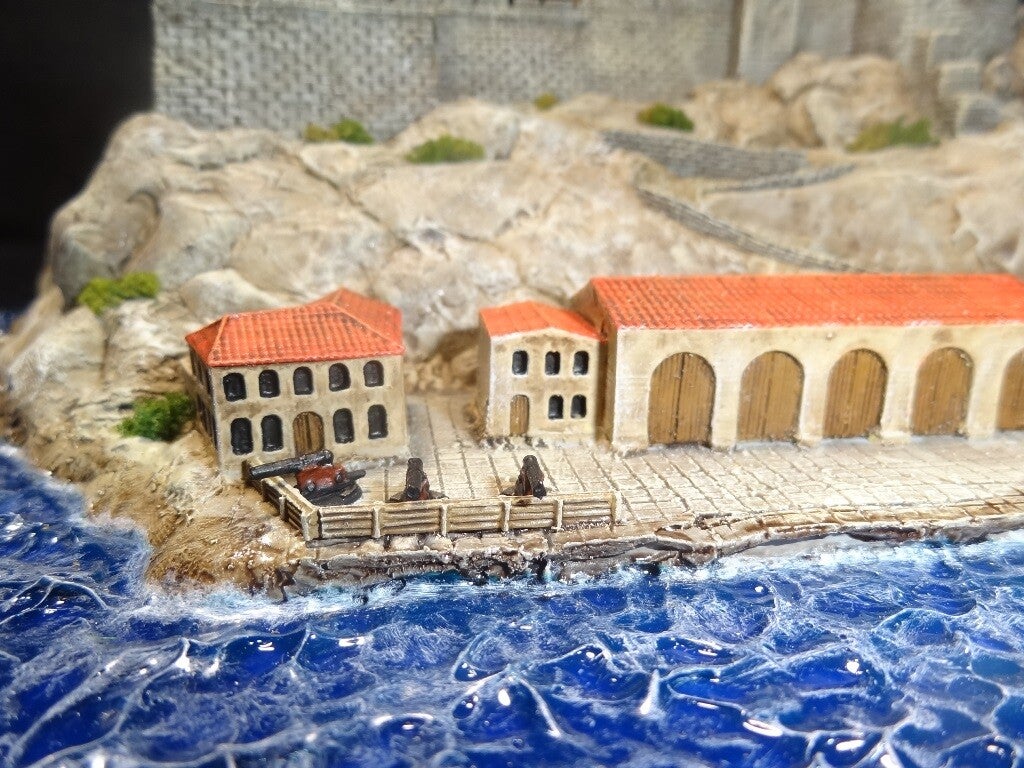 Diesmal ein etwas größeres Geländeteil für Black Seas. Eine Insel mit, Festung, Hafen, Hafengebäude und Kaserne. Die Gebäude (sehr gute Qualität) sind bei http://modeljship.com käuflich erwerbbar.